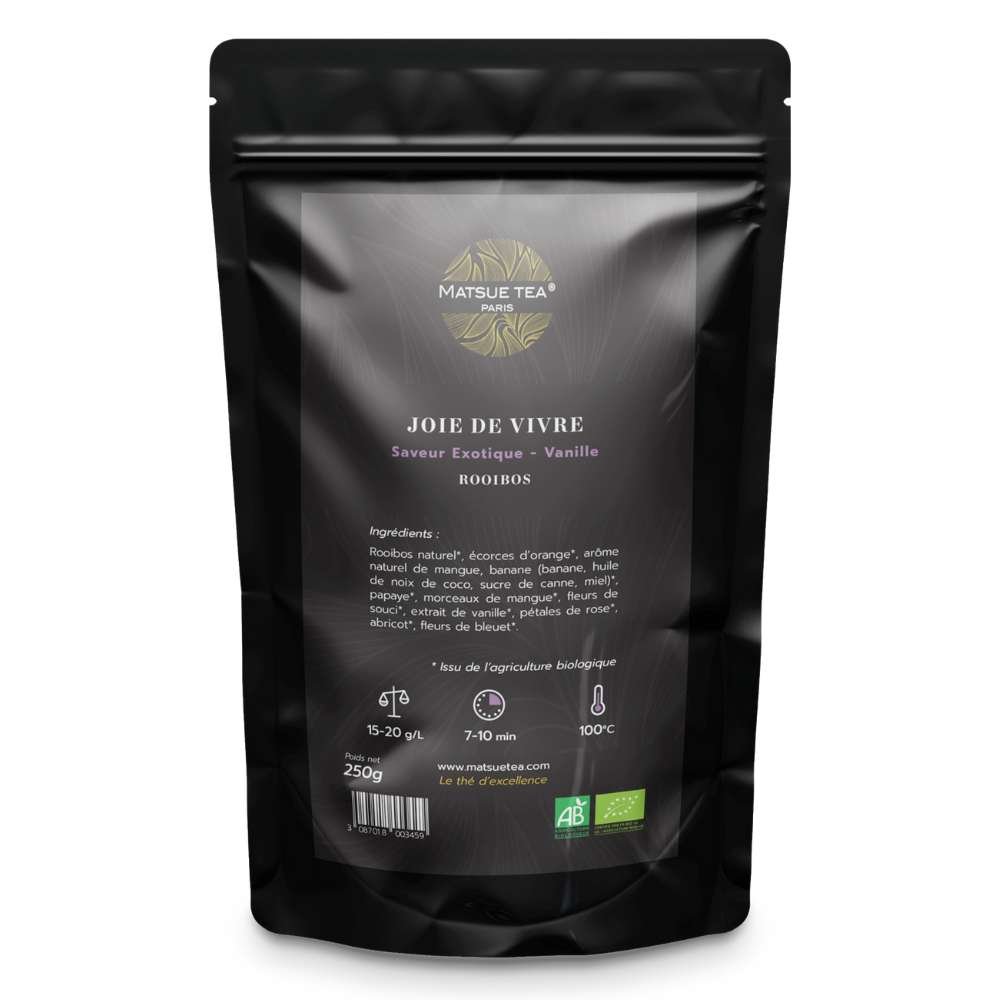 Le Rooibos bio JOIE DE VIVRE de qualité PREMIUM de chez MATSUE TEA est un mélange très aromatique et fruité qui combine des écorces d’orange, de la mangue, de la banane, de l’huile de coco, du sucre de canne, du miel, de la papaye, des morceaux de mangue, des fleurs de souci, des pétales de rose, de l’extrait de vanille, des abricots et du bleuet. Ce mélange de saveurs offre une expérience gustative unique et agréable pour les amateurs de rooibos et de thés fruités.