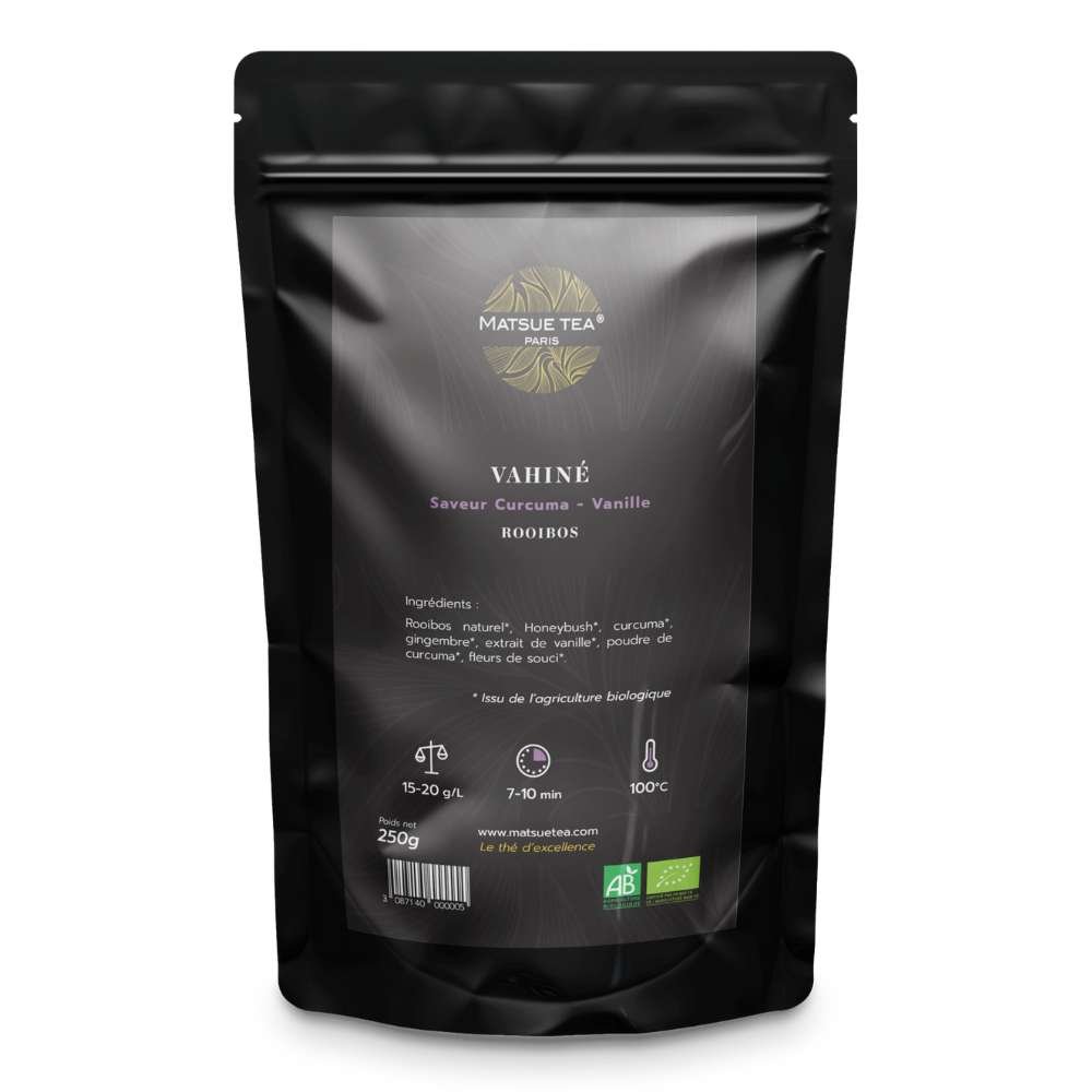 La tisane bio VAHINÉ de qualité PREMIUM de chez MATSUE TEA est agrémenté de rooibos naturel, de vanille et d’arômes naturels. La note douce et chaleureuse de la vanille vous enchantera, tandis que la cardamome et le gingembre apporteront une saveur légèrement épicée et rafraîchissante. Les bienfaits du curcuma seront vous séduire tant par ses bienfaits anti-inflammatoires et énergisants, que par son goût délicieux.
